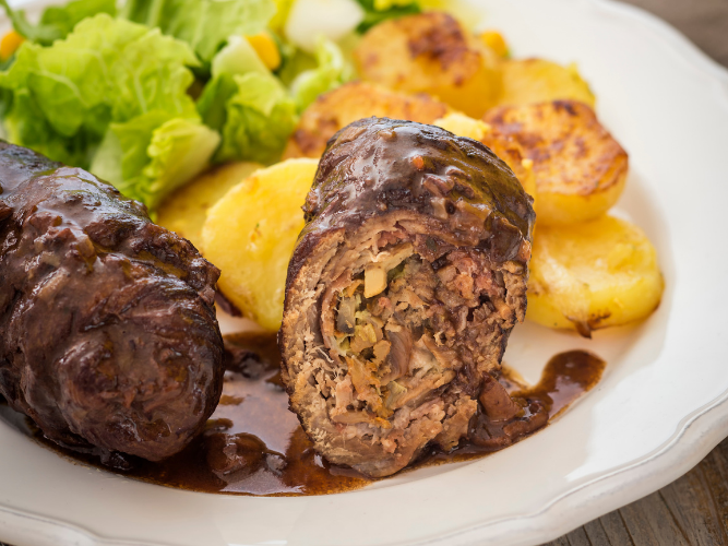 Večje goveje zrezke potolčemo, eno stran premažemo z gorčico ter na njih zložimo panceto, drobnjak ali še kumare. Zvijemo in zavežemo z vrvico v rulado, tako da do v njej vlakna po dolgem. Prevežemo z vrvico in v naoljeni posodi popečemo z vseh strani. nato ruladice umaknemo ob rob posode, ki je položen izven kuhalnega območja štedilnika ter na malo dodanega olja spražimo šalotko ter dodamo česen, da zadiši in ostale začimbe.